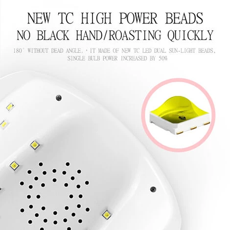 Plus proche de la lumiere blanche, peut secher le gel UV, le vernis a ongles et le gel LED. (Ne peut pas etre utilise pour secher le vernis a ongles.) Grâce a sa conception de modele indolore, il ne nuit pas a votre peau, ce qui signifie que vos mains ne deviennent pas noires.