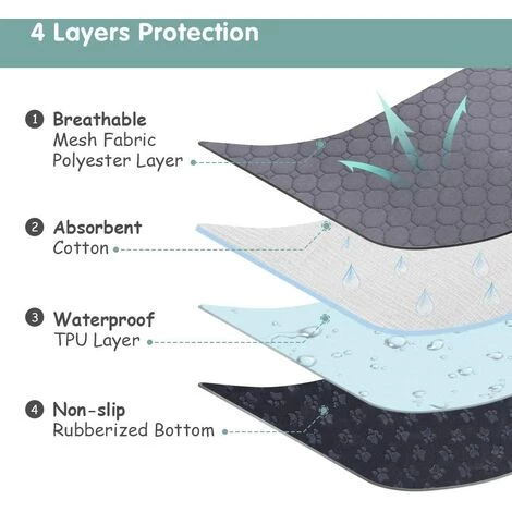 Ultra-Absorbant et Anti-Fuite :tapis absorbant chien est fabriqué en 4 couches, avec maille d’air sur le dessus, il est si absorbant que les liquides pénètrent rapidement et ne se propagent pas. Et le coton au milieu a une bonne capacité d’absorption. La couche intérieure en tpu imperméable empêche les fuites de liquide et ajoute la perméabilité à l’air. En outre, le bord du tapis educateur chiot peut empêcher le liquide de s’écouler