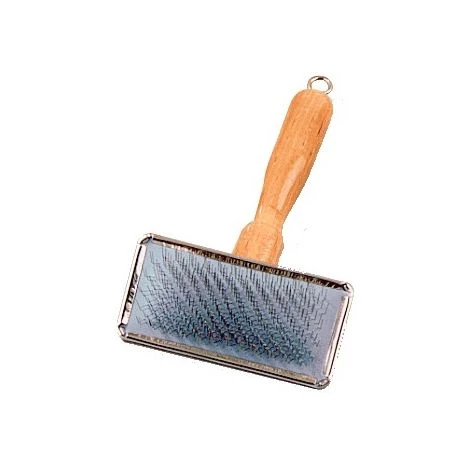 Brosse carde métal pour chien et chat, avec manche en bois et picots semi-durs.