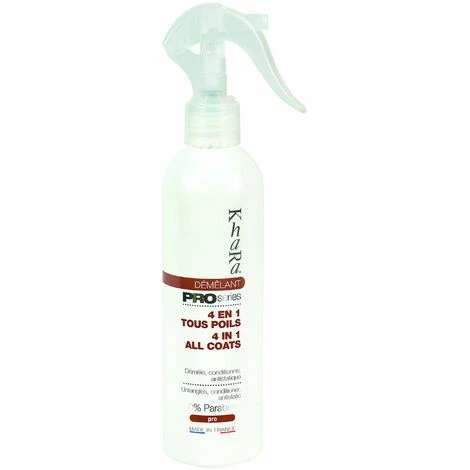 Ce produit est un super démêlant 4 en 1 pour les poils de votre animal. Convient à tous types de pelages et particulièrement aux fourrures très emmêlées.En vaporisateur de 250ml. Démêlant 4 en 1 tous poils Khara. Il conditionne, démêle, supprime l’électricité statique et redonne de la douceur aux poils de votre chien. Démêlant puissant qui sera très utile pour les animaux qui ont une fourrure très emmêlées. Idéal aussi comme conditionneur avant une exposition canine. 0% PARABEN Comment déméler le poil de votre chien rapidement, sans shampooing et sans rinçage ? Notre conditionneur-démêlant en spray professionnel Khara pour chiens vous aidera à déméler simplement le poil de votre chien sans avoir besoin de le laver entièrement. Idéal pour le démélage rapide si vous n’avez pas le temps de laver votre chien avec ses shampooing Khara habituels, ce spray supprimera l’élétricité statique du poil tout en lui redonnant souplesse et brillance. Sa forme en spray vous fera gagner du temps. Léger, ce produit n’allourdira pas le poil de votre chien. Caractéritiques : Conditionne, démêle, supprime l’électricité statique et redonne de la souplesse au poil du chien, Convient parfaitement aux fourrures très emmêlées et est idéal comme conditionneur avant l’exposition canine, Convient pour tous pelages, En vaporisateur 250ml, Sans rinçage.