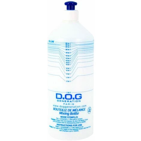 Bouteille de mélange pour shampoing Dog GénérationPermet de diluer le shampoing plus facilement.Contenance : 1 L Bouteille de mélange Dog Génération pour shampooing La bouteille de mélande Dog Génération est parfaite pour diluer les shampooings. il suffit de remplir cette bouteille avec de l’eau à la ligne souhaitée et remplir avec un shampooing à la ligne de remplissage. Bien agiter avant utilisation.