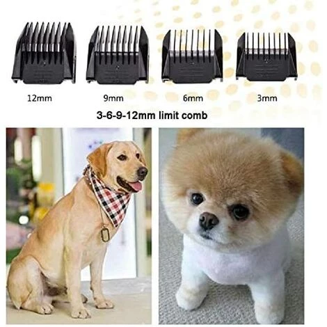 - [4 peignes de garde, tout-en-un] Ce kit de toilettage pour chiens, chats, chevaux. 3 mm/6 mm/9 mm/12 mm, le peigne de coupe réglable est applicable pour couper les cheveux de différentes longueurs ; et les peignes de guidage amovibles permettent des changements de peigne rapides et faciles et une polyvalence accrue.