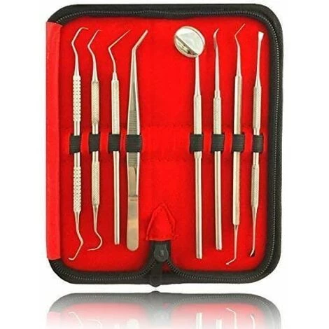 KIT D’ENTRETIEN BUCCAL PROFESSIONNEL 8-EN-1 : Il y a 1 aiguille en forme de marteau, 1 aiguille en dents de scie, 1 aiguille pointue, 1 détartreur dentaire faucille, 1 pince à épiler, 1 sonde, 1 miroir dentaire et 1 détartreur dentaire hack. Il est conçu à la fois pour les dentistes professionnels et pour un usage personnel.