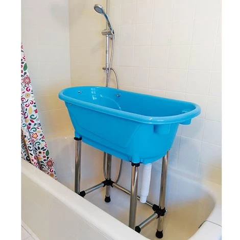 Maintenant disponible la solution pour baigner et sécher nos chiens ou chats dans le bain à la maison sans souffrir de maux de dos. Il est très léger et conçu pour s’adapter facilement dans la baignoire. S’écoule directement dans le bain.