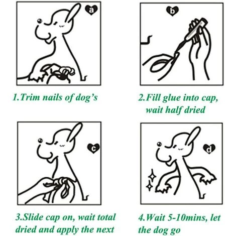 - ?Conseils d’application? Le kit pour la maison de couvre-ongles souples est conçu pour les chiens. C’est le travail de 2 personnes. CONSEILS : 1. La bonne taille est importante. Essayez-en un sans colle. S’il ne convient pas, coupez l’ouverture du capuchon jusqu’à ce qu’il s’adapte parfaitement aux griffes de votre chien. OU, retour pour remplacement 2. Coupez et lissez les ongles du chien 3. Assurez-vous que la fourrure est séparée avec la patte, pour éviter de coller ensemble 4. Utilisez un peu de colle dans le capuchon, pas trop, couvrez UNIQUEMENT l’ongle de votre chien. Plus de conseils, veuillez vous référer à la description.