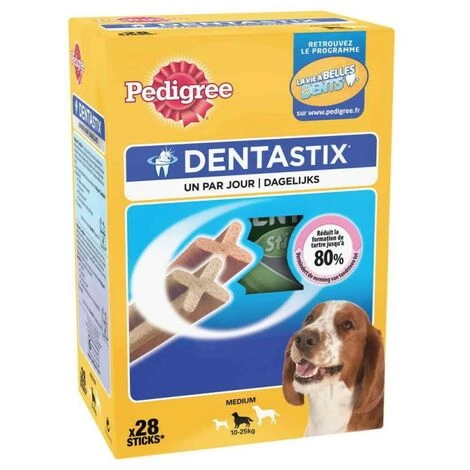 Les bâtonnets Pedigree Dentastix sont des friandises à mâcher pour aider le chien à conserver une bonne hygiène bucco-dentaire.En utilisation quotidienne, ces bâtonnets en forme de X aident à réduire jusqu’à 80% la formation de tartre, grâce à leur texture spéciale et aux ingrédients actifs.Les bâtonnets Dentastix contiennent peu de matières grasses, et sont sans sucres ajoutés et sans colorant ni arôme artificiels.Pour encore plus de plaisir, offrez à votre chien ce jouet à friandise Denties Toy qui est compatible avec ces friandises. Ne convient pas aux chiots de moins de 4 mois.