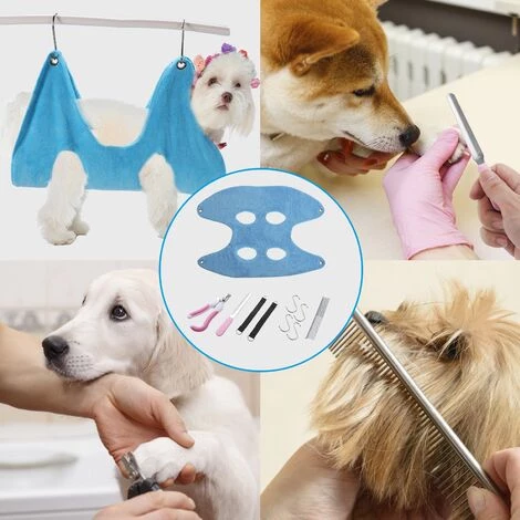 Kit et nettoyage : le kit comprend : 1 hamac de toilettage, 4 crochets en forme de S, 1 coupe-ongles pour animaux de compagnie, 1 lime a ongles pour animaux de compagnie, 1 peigne droit pour animaux de compagnie. Le sac de retenue pour hamac est tres facile a nettoyer. Le hamac de toilettage pour chien pour la coupe des ongles peut etre lave non seulement a la main mais aussi a la machine. La flanelle douce et legere seche rapidement apres le lavage.
