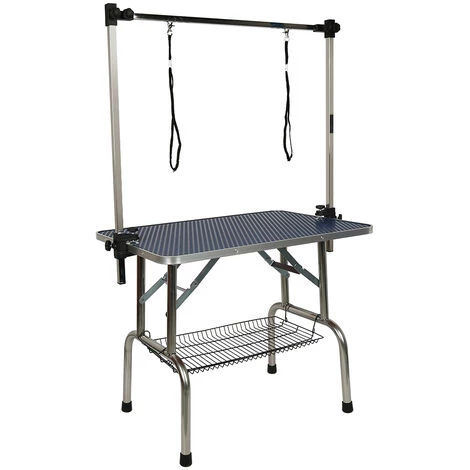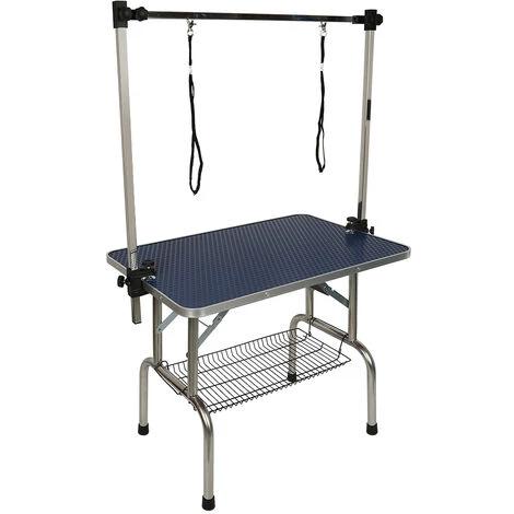 Bichonnez votre chien ou votre chat dans de bonnes conditions grâce notre table de toilettage avec deux sangles. Sa large surface est recouverte d’une texture en caoutchouc antidérapante qui résiste aux griffures – idéal lorsque votre compagnon sort du bain après son shampooing. La hauteur et la position de la potence sont réglables. Il est possible de la retirer si vous en n’avez plus besoin. Les deux sangles permettent de maintenir votre animal en place pendant les soins. Vous pourrez alors brosser ou couper les griffes des bêtes les plus anxieuses ou agitées. Une fois le toilettage fini, la table se replie. Vous pouvez ainsi la transporter facilement lors de vos déplacements sur des salons ou des expositions canines ou félines. La table de toilettage peut également servir de table de présentation pour mettre en avant votre fidèle compagnon lors de concours.