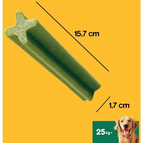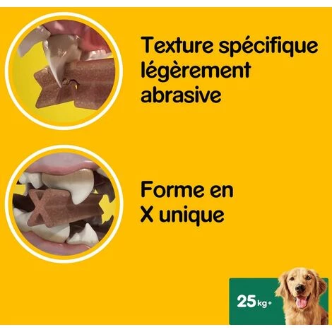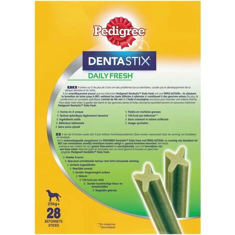 4 chiens sur 5 de plus de 3 ans souffrent de problèmes bucco-dentaires causés par l’accumulation de plaque dentaire et de tartre autour de la ligne des gencives, qui peut être réduite par une routine efficace de soins bucco-dentaires. Parce qu’ils utilisent leur bouche pour tout, il est essentiel pour les chiens avoir des dents et gencives en bonne santé. Il est scientifiquement prouvé que les sticks pour chien Pedigree Dentastix Fresh, qui ont une forme unique en X, réduisent jusqu’à 80 % de la formation de tartre lorsqu’ils sont donnés quotidiennement. Ils contiennent un mélange actif unique d’extrait de thé vert et d’huile d’eucalyptus brevetée, pour une haleine fraîche. Ces bâtonnets à mâcher pour chien ont été conçus pour que la durée de mastication soit assez longue pour être efficace. La texture légèrement abrasive combinée avec des ingrédients actifs agissent avec la salive de votre chien pour réduire la formation de plaque dentaire et de tartre. En plus des avantages en termes d’hygiène bucco-dentaire, les sticks pour chien Pedigree Dentastix Fresh ont un goût fameux, sont faibles en matières grasses, ne contiennent pas d’arômes et colorants artificiels et sont sans sucres ajoutés. Pedigree, nous leur devons le meilleur. Avec l’aide de vétérinaires et nutritionnistes du centre Waltham, Pedigree a développé une gamme de délicieux bâtonnets à mâcher pour chien qui réduisent la formation de plaque dentaire et de tartre, tout en limitant le risque de problèmes bucco-dentaires. Il est scientifiquement prouvé que les sticks dentaires pour chien Pedigree Dentastix Fresh réduisent jusqu’à 80 % de la formation de tartre ; à donner quotidiennement