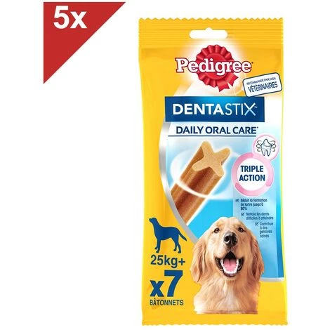 Les bâtonnets à mâcher Pedigree Dentastix vous aident à garder les dents de votre chien saines et des gencives fortes. Technologie de bâtonnet unique brevetée. En utilisation quotidienne, ce stick dentaire en forme de X unique aide à réduire jusqu’à 80% la formation de tartre. Avec une texture légèrement abrasive conçue pour permettre un frottement sur les dents et des ingrédients actifs qui agissent directement sur la salive qui aide à réduire la formation du tartre. Ces bâtonnets nettoient les dents difficiles à atteindre et contribuent à des gencives saines.