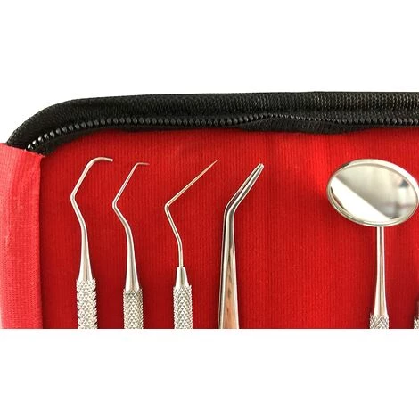 KIT D’ENTRETIEN BUCCAL PROFESSIONNEL 8-EN-1 : Il y a 1 aiguille en forme de marteau, 1 aiguille en dents de scie, 1 aiguille pointue, 1 détartreur dentaire faucille, 1 pince à épiler, 1 sonde, 1 miroir dentaire et 1 détartreur dentaire hack. Il est conçu à la fois pour les dentistes professionnels et pour un usage personnel.