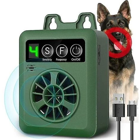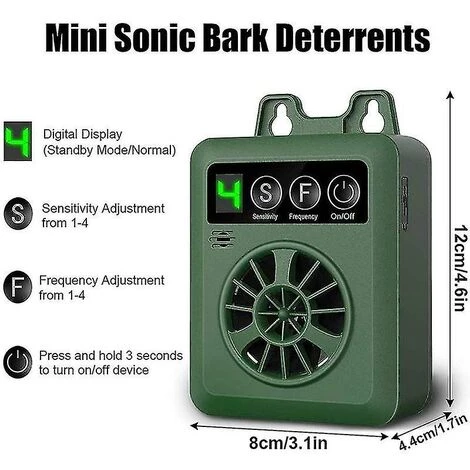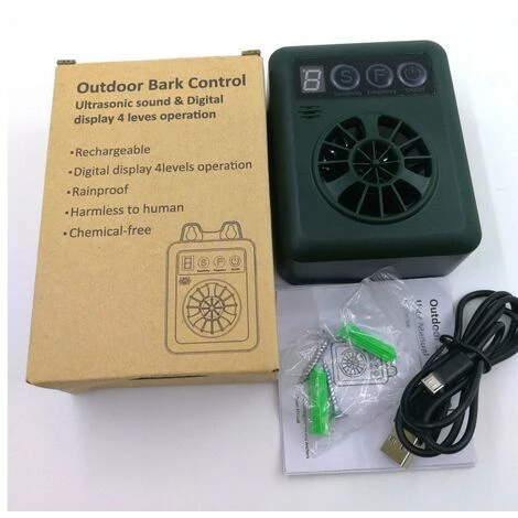 Il a besoin de piles 9 V – (les piles ne sont pas incluses). L’appareil d’aboiement à ultrasons extérieur a un indicateur de puissance. Lorsque vous partez, il peut être réglé sur « Off » pour protéger la batterie. Conçu pour une utilisation en extérieur, appareil anti-aboiement à ultrasons extérieur.