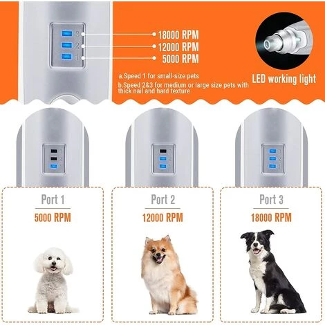 Meuleuse de Clous à 3 Vitesses: La meuleuse de clous est équipée d’un réglage à 3 vitesses de bas en haut (5000 /12000 /18000 tr/min). Fournit suffisamment de puissance pour manipuler des clous d’animaux de différentes tailles.