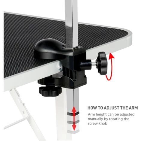 - Bras Réglables: La potence amovible est réglable en hauteur par la pince et les deux sangles réglable par une manche transparente, longeur 60cm, pour s’adapter aux animaux domestiques de différentes tailles et vous aider à maintenir l’animal sur la table.